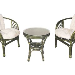 Комплект из натурального ротанга, состоящий из двух кресел и круглого столика с плетеной столешницей. Стекло входит в комплект.